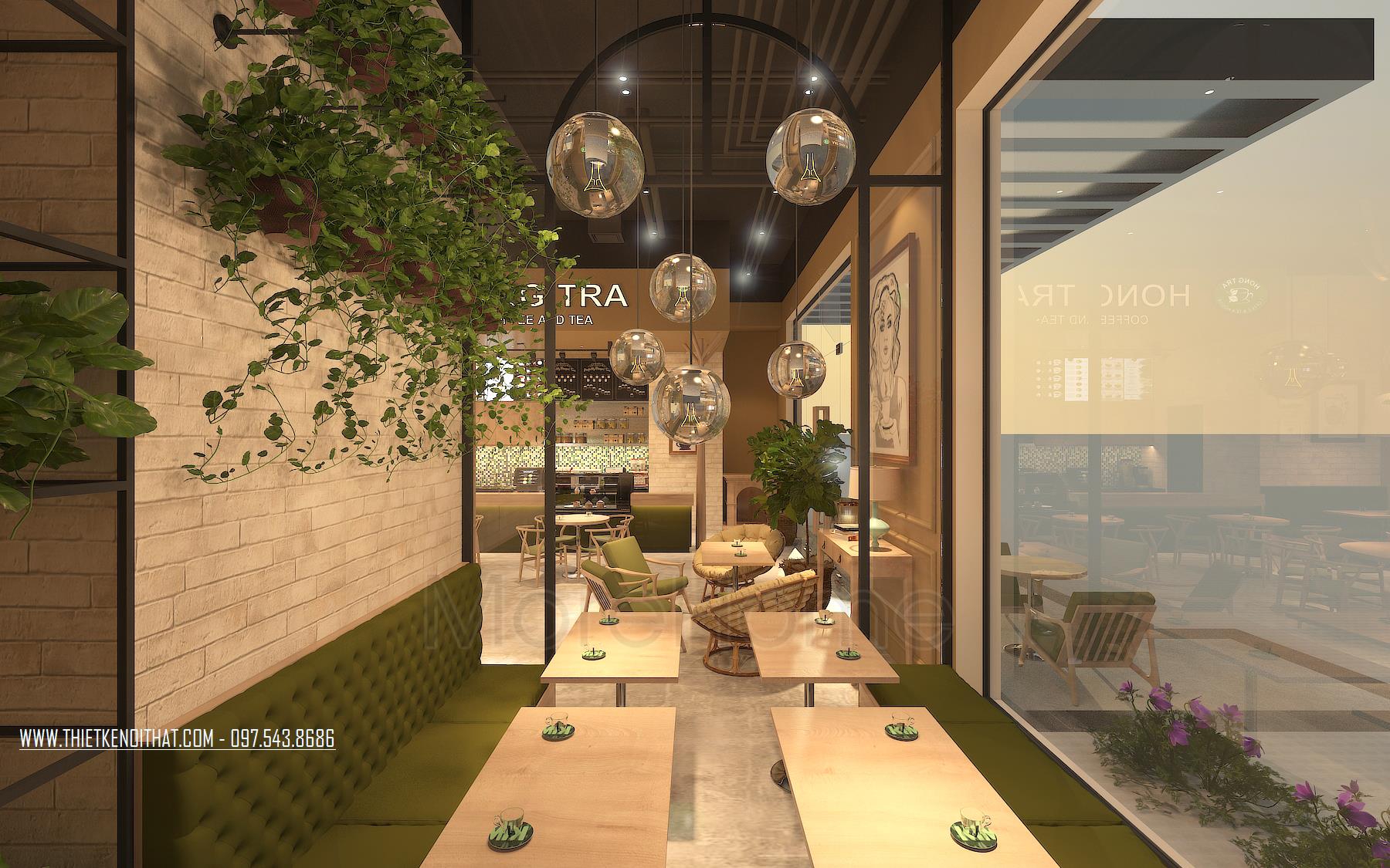 Thiết kế quán cafe với sự kết hợp của cây xanh và đèn chùm là sự lựa chọn thông minh