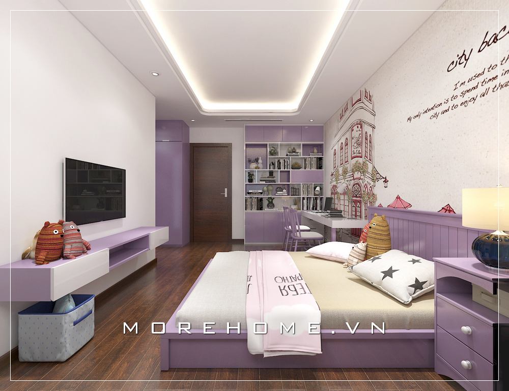 Bố trí phòng ngủ dành cho con với lối bố trí đơn giản với nội thất giường hiện đại gỗ công nghiệp nối liền với bàn học độc đáo và tiện nghi