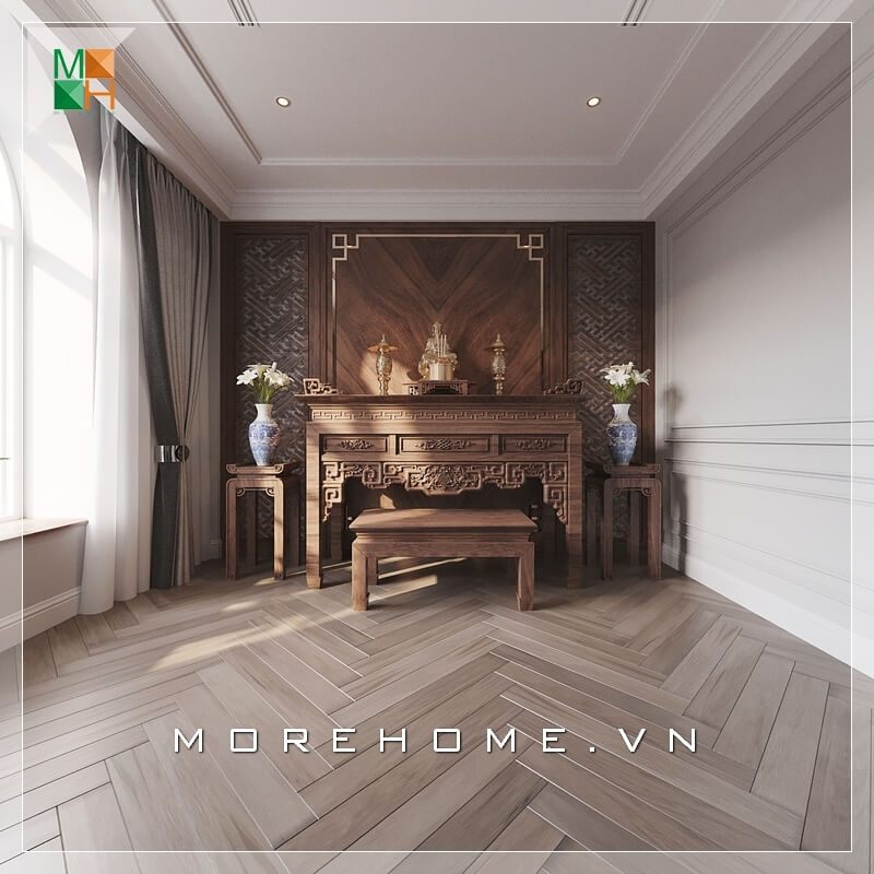 Mẫu bàn thờ từ gỗ óc chó cao cấp với những đường chạm trổ tinh tế của phong cách tân cổ điển nâu trầm ấn tượng trong biệt thự