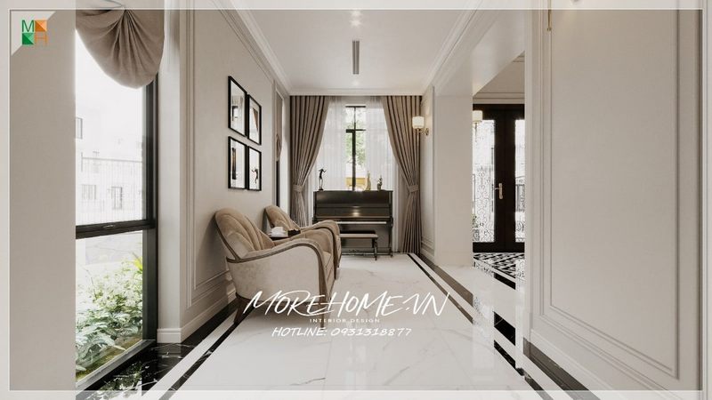 Sảnh hành lang biệt thự được bố trí một bộ sofa đơn để gia chủ có thể thay đổi không gian tiếp khách hoặc dành thời gian thư giãn cá nhân