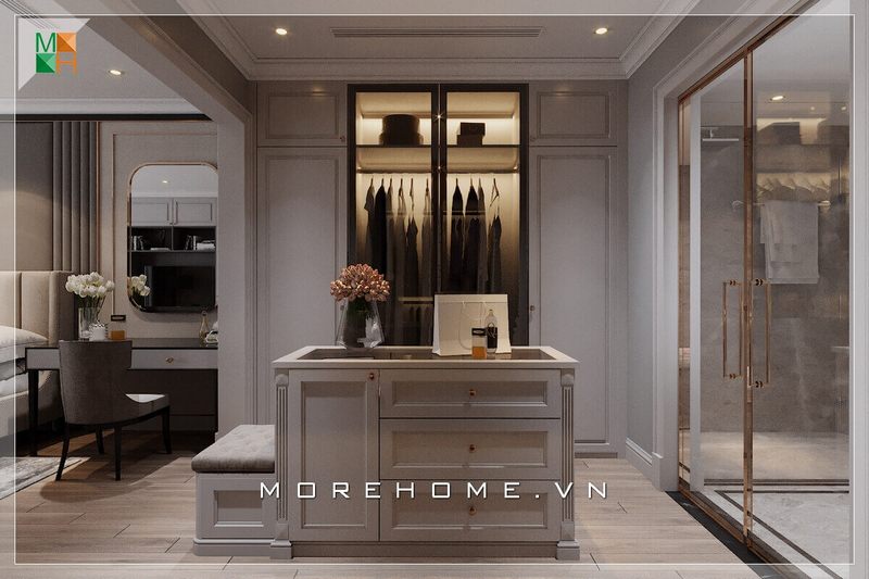 Thiết kế phòng ngủ liền phòng thay đồ, với phong cách đương đại màu trắng sang trọng, phù hợp với phòng ngủ có diện tích rộng như phòng ngủ master