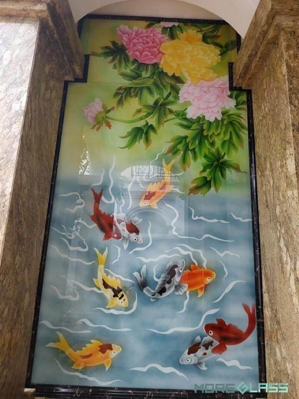 Vách tường kính cường lực tranh cá và hoa dành cho nhà phố, chung cư, biệt thự cao cấp, sang trọng
