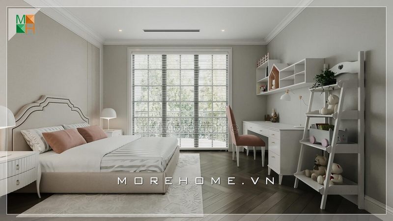 Phòng ngủ của biệt thự đẹp sang trọng tinh tế lại ấm áp, gần gũi từ cách bố trí nội thất hiện đại tone trắng nhấn hồng thơ mộng, thu hút.