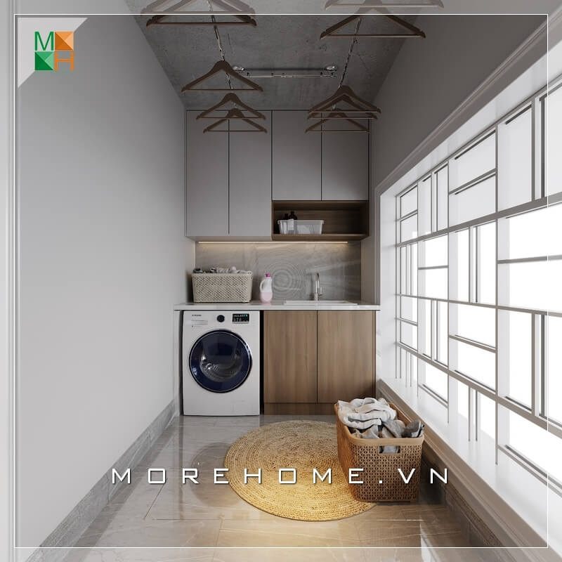 Khoảng không gian thoáng đãng được bố trí hệ thống tủ đựng hiện đại thuận tiện cho việc giặt và phơi đồ