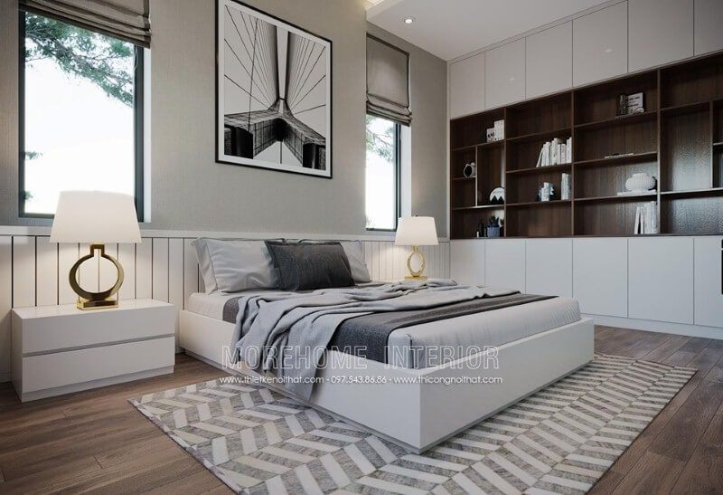 Những bố trí nội thất vuông vắn, không cầu kì rườm rà mà mang vẻ đẹp tiện nghi của phong cách hiện đại thật cuốn hút trong không gian phòng ngủ biệt thự, nhà phố