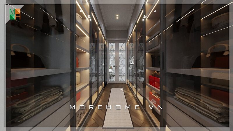 Phòng thay đồ, để quần áo đẹp sang trọng tiện lợi với hệ thống tủ đựng hiện đại là một trong những không gian của thiết kế biệt thự, nhà phố