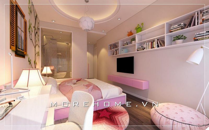 Thiết kế nội thất hiện đại cho phòng ngủ của bé gái bằng gam màu hồng phấn sẽ tạo nên một cảnh ấn tượng, dễ thương, nhẹ nhàng và sang trọng.