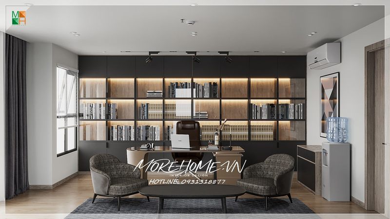 Phòng giám đốc được thiết kế với phong cách hiện đại, đầy đủ các tiện nghi và hợp phong thủy, tạo ra sự uy quyền và quyền lực của người lãnh đạo của một công ty, doanh nghiệp.