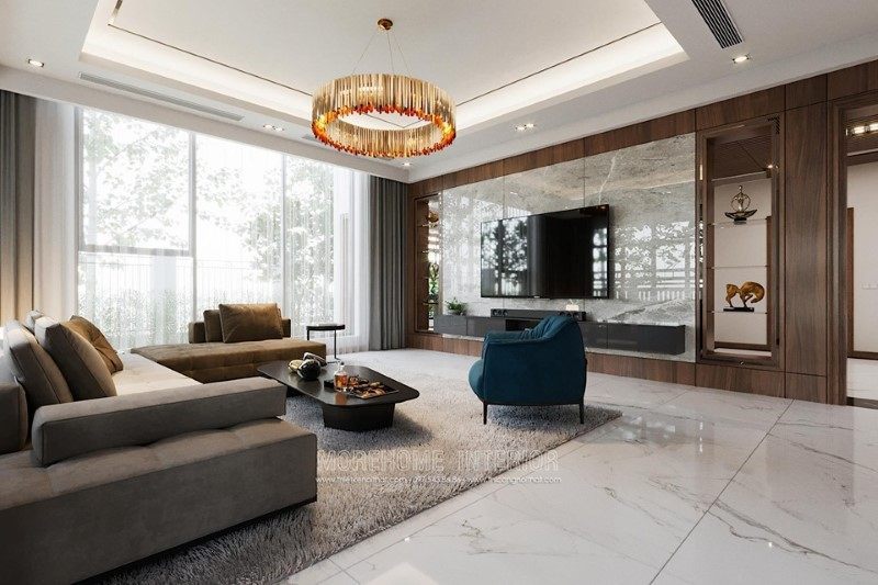 Mẫu thiết kế nội thất phòng khách sử dụng gỗ tự nhiên có màu trầm và kiểu dáng đơn giản giúp tạo nên phong cách đẳng cấp và trẻ trung hiện đại cho ngôi nhà của bạn.